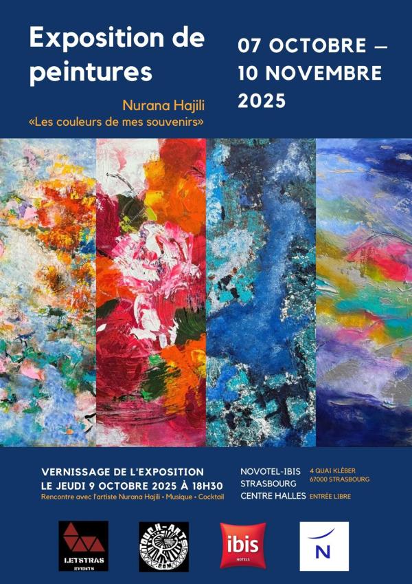 Venez nombreux découvrir les toiles de Nurana Hajili, artiste peintre, lors de l’exposition « Les couleurs de mes souvenirs » qui aura lieu au Novotel-Ibis centre des Halles à Strasbourg du 7 octobre au 10 novembre 2025. Un vernissage se tiendra le jeudi 9 octobre 2025 à partir de 18h30 en présence de l'artiste peintre, suivi d’un petit concert et d’un cocktail.